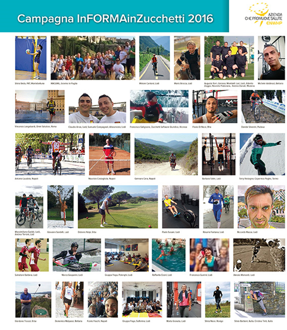Ne angajăm să organizăm activități pentru susținerea unei rutine zilnice ce implică activități fizice, care să le permită angajaților noștri să adopte un stil de viață sănătos. Promovăm mersul pe jos în grupuri prin campanii specifice pe rețelele sociale. Iată colajul pentru campania InForma (Rămâi în formă) a companiei Zucchetti.